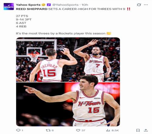 2.謝潑德單場(chǎng)9個(gè)三分是本賽季火箭球員最多;