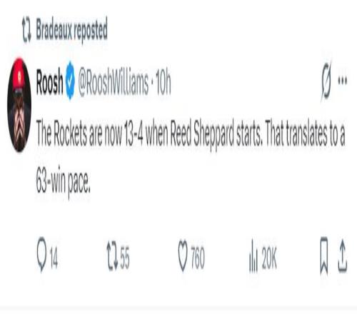 休媒Roosh寫道,本賽季謝潑德先發(fā)時(shí)火箭13勝4負(fù),換言之火箭隊(duì)本有希望拿到63勝。(除此之外謝潑德拿到20分的比賽有12場(chǎng)火箭拿到9勝3負(fù),火箭也有62勝)