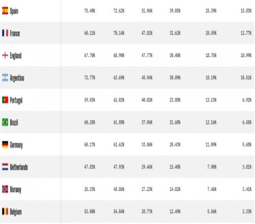 opta預測世界杯奪冠概率: