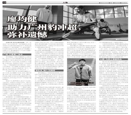 廖均健是廣州豹本賽季重點引援目標。出生于廣西北海的廖均健,職業足球生涯起步于東莞,2012年從中乙東莞南城轉會至中甲廣東日之泉,從此便與廣州結緣,從那時起,他的家人來到廣州并定居于此,廣州這座城市成為他的第二故鄉:“我老家是廣西北海的,但2012年來到廣東日之泉后,我的家人就都來廣州了。從那時起,我們就基本在廣州生活了。”
