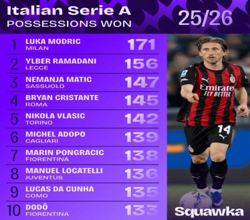 本賽季意甲奪回球權榜:40歲莫德里奇171次第一,馬蒂奇第三 Twitter 2026-04-03 20:22:41 體育播報4月3日宣 足球數據網站Squawka統計本賽季至今意甲球員奪回球權排行榜,40歲莫德里奇171次第一,馬蒂奇第三。附本賽季意甲奪回球權榜:1 莫德里奇(AC米蘭)171次2 拉馬達尼(萊切)156次3 馬蒂奇(薩索洛)147次4 克里斯坦特(羅馬)145次5 弗拉西奇(都靈)142次6 阿多博(卡利亞里)139次7 龐格拉契奇(佛羅倫薩)138次8 洛卡特利(尤文)136次9 達庫尼亞(科莫)135次10 多多(佛羅倫薩)133次足球免費觀看_意甲免費觀看_AC米蘭免費觀看_足球高清在線_意甲高清在線_AC米蘭高清在線 足球 意甲 AC米蘭 尤文圖斯 羅馬 佛羅倫薩 科莫 卡利亞里 薩索洛 都靈 上一篇: 本賽季意甲成功過人榜:伊爾迪茲69次居首,尼科帕斯55次第二 下一篇: 帶領科莫三戰全勝,法布雷加斯當選意甲3月最佳教練
