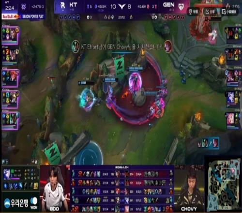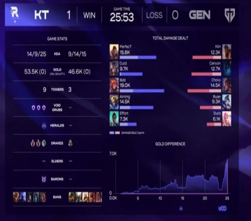 首局比賽GEN直接放出EZ卡爾瑪?shù)慕M合給KT自己下路挨揍!前期Cuzz趙信和Canyon夢魘都有g(shù)ank節(jié)奏,不過KT依靠下路組的強勢先行拿下三條小龍,同時經(jīng)濟還有3K左右的領(lǐng)先!GEN則是持續(xù)偷發(fā)育找機會沒讓劣勢被擴大!關(guān)鍵的24分鐘河道遭遇戰(zhàn),GEN依靠先手開團秒掉對手野輔開大龍!但是KT的poke傷害打滿,Bdd佐伊一個Q還搶到了大龍啊!GEN想撤結(jié)果撤不掉了,被KT抱團追擊逐個擊破,KT反手打出0換5團滅GEN,直接中路一波可以結(jié)束掉首局比賽!