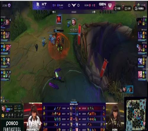 【5:20】Cuzz趙信gank上路,幫助PerfecT杰斯擊殺掉了Kiin奎桑提!PerfecT杰斯一血!同時GEN拿下第一條小龍,但是Bdd佐伊睡到了Canyon夢魘將他留住!KT的0換2!