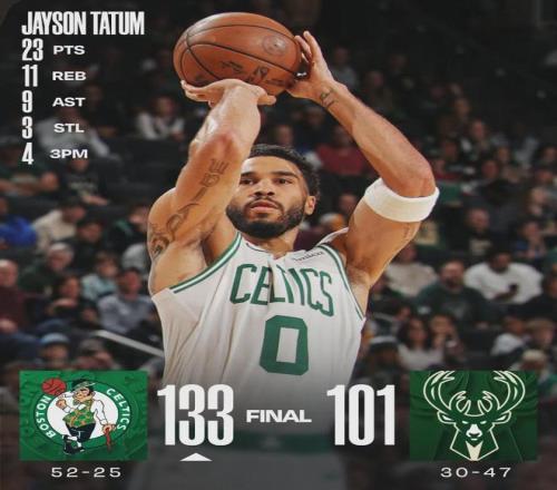 北京時間4月4日,NBA常規賽:雄鹿101-133慘敗給凱爾特人。最近三次交手,凱爾特人一共贏了雄鹿89分。塔圖姆16中8得到23分11板9助3斷2失誤,正負值+30!杰倫-布朗17中7得到26分3板4助2斷2失誤,正負值+27。