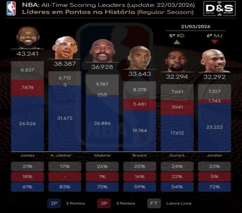 北京時間3月22日,杜蘭特在火箭對陣熱火的比賽里,用一記底角三分完成了對喬丹的超越,正式升到歷史第5位。到了3月25日,ESPN的最新榜單顯示,詹姆斯以43253分穩居第1,賈巴爾38387分排第2,馬龍36928分排第3,科比33643分排第4,杜蘭特32334分排第5,喬丹32292分則落到了第6。