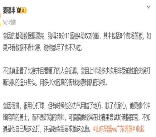 廣東隊輸了山東13分,麥考爾的正負值也恰好是-13,從控制變量法的角度出發(fā),這場麥考爾如果不打,那廣東隊可能有贏的機會,當然了,麥考爾打得差不要緊,其實真正要命的是杜鋒仍然意識不到麥考爾的真正問題,還是對他非常信任,老是幻想著麥考爾還能練出來。