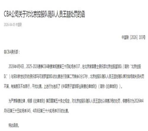 王喆的上述行為違反《中國男子籃球職業(yè)聯(lián)賽紀律準則》,為嚴肅聯(lián)賽紀律,根據(jù)《紀律準則》第四章第五十條之規(guī)定,對北控隨隊人員王喆處以停賽2場的處罰,停賽場次為2026年4月6日第三十五輪場序345、4月8日第三十六輪場序355的比賽。