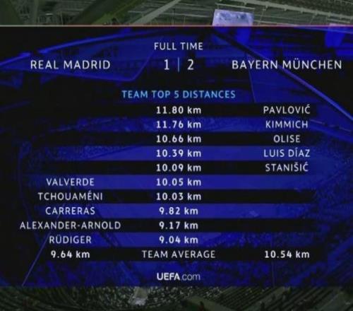 4、跑動(dòng)數(shù)據(jù)方面:帕夫洛維奇本場(chǎng)比賽跑動(dòng)11.80km,成為全場(chǎng)最多的同時(shí),跑動(dòng)榜前五均是拜仁球員,皇馬跑動(dòng)距離最多的球員,則是巴爾韋德,僅為10.05km……