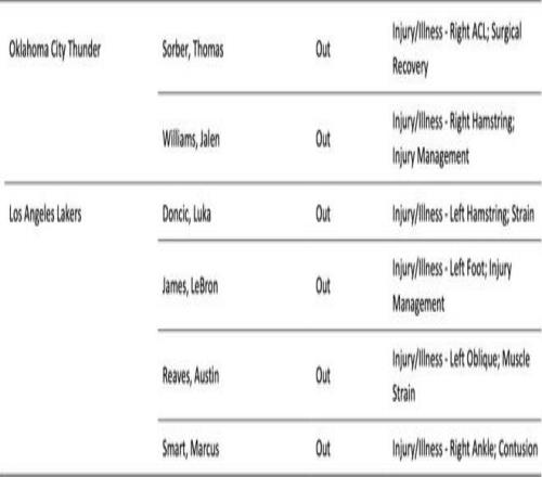 除此之外,里夫斯(左側(cè)腹斜肌拉傷)、斯馬特(右腳踝挫傷)、詹姆斯(左腳傷病管理)和海斯(左腳酸疼)均因傷缺席本場(chǎng)比賽。