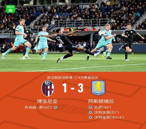 北京時間4月10日歐足聯歐洲聯賽 1/4決賽首回合,博洛尼亞對陣阿斯頓維拉。上半場孔薩首開記錄,下半場沃特金斯破門擴大比分,90分鐘喬納森-羅扳回一球,隨后沃特金斯破門梅開二度。最終比分博洛尼亞 1-3 阿斯頓維拉。