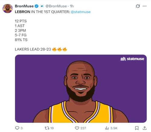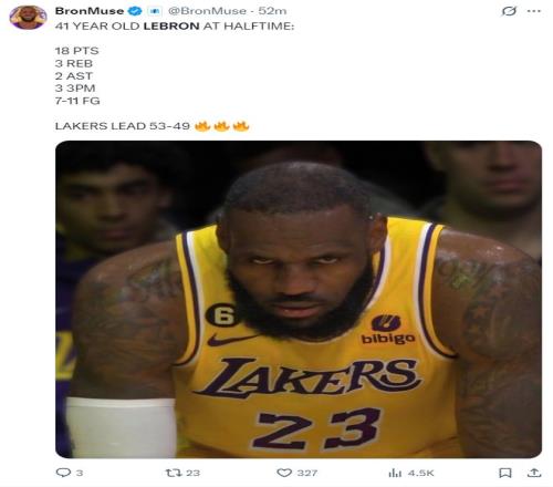 第二節的詹姆斯命中了第三個三分球,單節4中2拿到6分3籃板1助攻,半場11中7,三分4中3,已經拿到18分3籃板2助攻,湖媒已經曬出老詹死亡之瞳的圖片來盛贊老頭的努力。