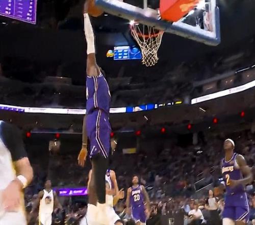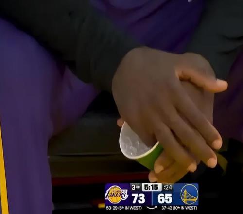 第三節詹姆斯在一次回防過程中送出了釘板大帽,但這個封蓋疑似戳傷了小拇指,他的小拇指打在了籃板上,隨后老詹表情痛苦。