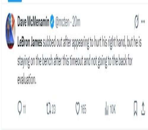 隨后戴夫-麥克梅納明報道:詹姆斯在比賽過程中似乎傷到了右手,隨后下場。但在這次暫停之后,他留在了替補席上,不會前往更衣室接受檢查。