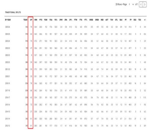 杜蘭特上一次單賽季打至少78場比賽好要追溯到17-18賽季,也就是30歲的杜蘭特,那個賽季他場均34.6分鐘,26分6.4籃板5助攻0.7搶斷1.1蓋帽,命中率52.1%,三分命中率35.3%,登場時間還不如37歲的他,效率也不如37歲的他。