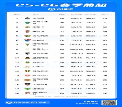三隊斷層!葡超積分榜:波爾圖葡體僅差2分本菲卡28輪不敗仍掉隊 直播吧 2026-04-12 20:25:16 體育播報04月12日宣 葡超第29輪,葡萄牙體育1-0擊敗阿馬多拉,與榜首波爾圖僅差2分,穆里尼奧執教的本菲卡雖然聯賽28輪不敗,但仍落后榜首7分。本賽季的葡超依舊是三大豪門之間的爭奪,波爾圖、葡體和本菲卡已經遠遠甩開其他對手,波爾圖聯賽唯一一敗是在2月3日1-2不敵卡薩皮亞;葡萄牙體育更是從去年8月1-2不敵波爾圖后,聯賽內再未輸球;本菲卡因為平局過多,在爭冠中已經落后。足球免費觀看_五洲免費觀看_葡超免費觀看_足球高清在線_五洲高清在線_葡超高清在線 足球 五洲 葡超 穆里尼奧 上一篇: K聯賽:和氣生財!樸哲宇補時絕平!金泉尚武11安陽FC! 下一篇: 返回列表