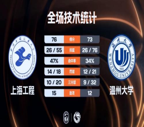 末節(jié)比賽,上海工程在前三分鐘沒(méi)有得分,溫州大學(xué)先拿6分穩(wěn)住局勢(shì),但之后的比賽他們突然斷電,上海工程打了一波11-0的攻勢(shì)直接完成反超,孫發(fā)航兩罰全中,盛家銘絕平三分不中,最終上海工程76-73險(xiǎn)勝溫州大學(xué)。