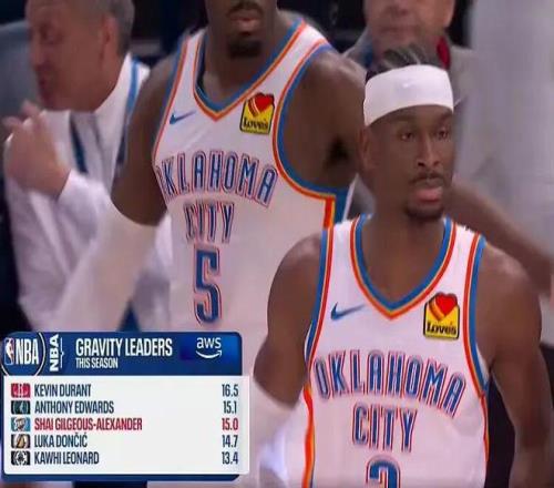 本賽季NBA推出了一個名為“引力值”的數據,用來量化球員牽制力,截至三月結束,杜蘭特的“引力值”是+16.5,聯盟斷檔第一。