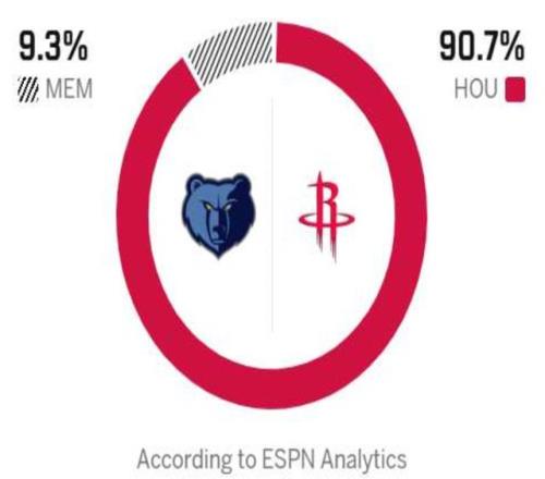 截止目前,火箭常規賽戰績51勝30負,灰熊則是25勝56負。而根據ESPN預測,本場比賽火箭勝率高達90.7%,而灰熊勝率僅有9.3%。