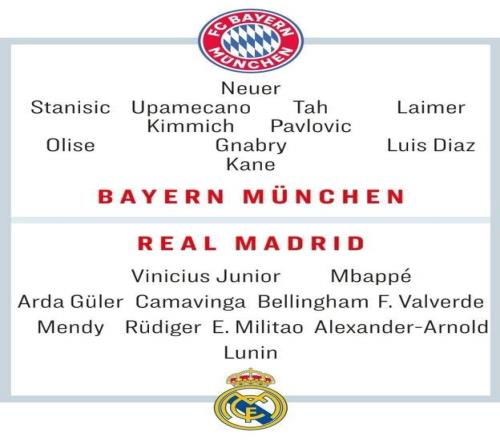 拜仁首發(4231):諾伊爾/萊默爾、若納坦·塔、于帕梅卡諾、斯坦尼西奇/帕夫洛維奇、基米希/路易斯·迪亞斯、格納布里、奧利塞/凱恩