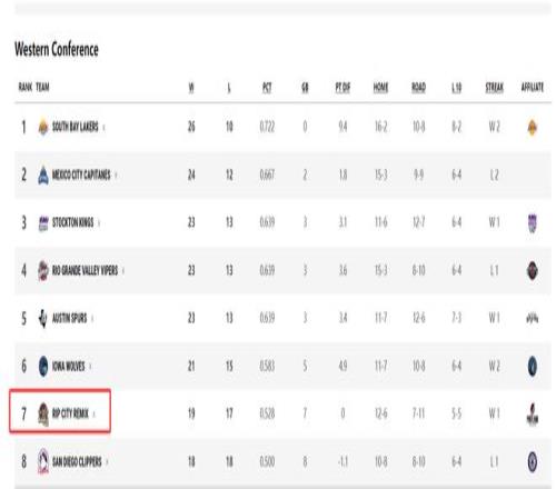 在G聯賽的混音是西部第七,在首輪黑七淘汰了墨西哥船長,回到NBA開拓者也是第七首輪要打拿到62勝的馬刺。