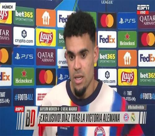 在拜仁主場與皇馬的歐冠1/4決賽次回合中,迪亞斯在終場前打入關鍵遠射,幫助球隊最終以4-3擊敗皇馬,以總比分6-4晉級四強。賽后,這名哥倫比亞射手接受了西班牙Movistar+的采訪。