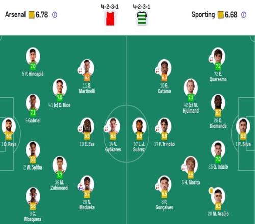 阿森納首發:1-拉亞、3-莫斯克拉、2-薩利巴、6-加布里埃爾、5-因卡皮耶、41-賴斯、36-蘇比門迪、10-埃澤(79'9-熱蘇斯)、11-馬丁內利(79'19-特羅薩德)、20-馬杜埃凱(63'56-道曼)、14-哲凱賴什(56'29-哈弗茨)