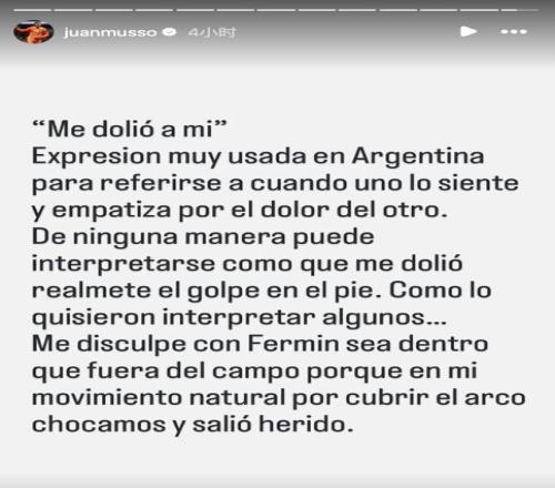 在一則標題為《這也讓我難受》的社媒動態中,穆索解釋表示:“這是阿根廷很常見的一種說法,用來表達你感受到、也能體會到別人的痛苦。這句話絕對不能被理解成那一下真的把我的腳踢疼了,但有些人就是想這么解讀……無論在場上還是場下,我都向費爾明道了歉。當時我只是自然地去封堵球門,結果兩個人撞在一起,他也因此受了傷。”
