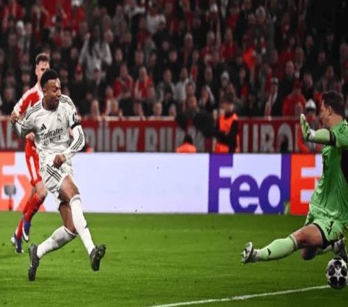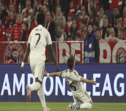 先看慕尼黑。首回合2-1領先的拜仁,回到主場卻經歷了一場史詩級對攻。上半場35秒,諾伊爾出球失誤,居萊爾吊射空門,創皇馬隊史歐冠第二快進球;隨后他再轟任意球世界波,29分鐘完成梅開二度,成為首位在安聯球場對拜仁雙響的客隊球員。姆巴佩推射破門,助皇馬半場3-2反超,總比分4-4!