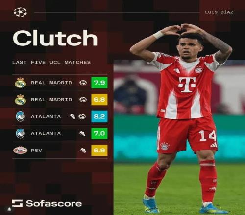 凌晨歐冠1/4決賽,拜仁主場4-3皇馬,兩回合總比分6-4淘汰對手晉級半決賽。去年夏天加盟球隊的迪亞斯在兩回合比賽中都貢獻了進球。此外,三輪淘汰賽他也是主導者。