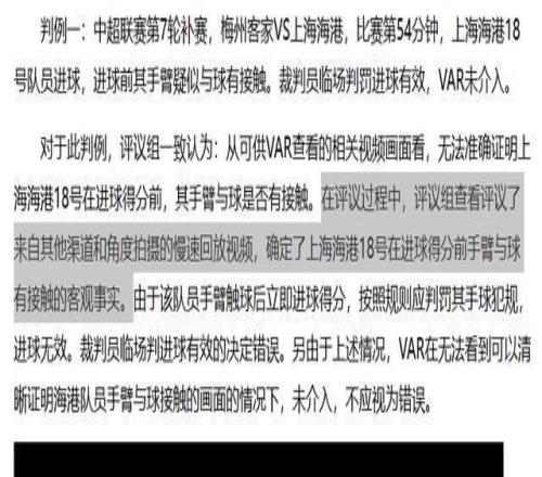 然而,這一標準與2024年足協評議口徑截然相反。在24賽季梅州客家對陣上海海港的爭議進球判例中,官方與VAR視頻同樣無法確認手球,評議組卻主動采納其他渠道慢速回放視頻,最終認定手球、進球無效。