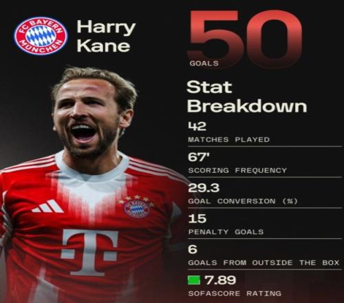 這其中,凱恩的出色發(fā)揮功不可沒,此役他打入1粒進球,這不僅是他個人本賽季歐冠打入的第12粒進球,更是他本賽季打入的第50粒進球!據(jù)統(tǒng)計,凱恩42場比賽打入50球,平均每67分鐘一球,射門轉(zhuǎn)化率高達29.3%!在本賽季歐冠打入15球的姆巴佩被淘汰之后,他將成為金靴的有力爭奪者!