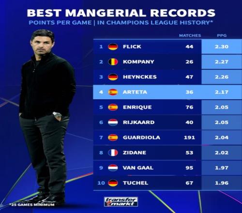 阿爾特塔以場均2.17分排在歷史第四,他一共執教了36場歐冠,戰績為24勝6平6負。他執教的第一場歐冠是2023年對陣朗斯。