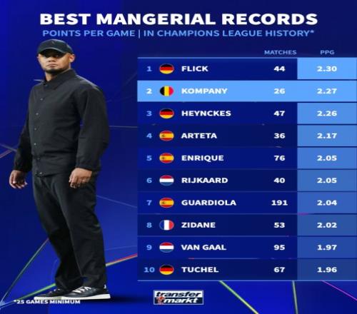 這場勝利也意味著,孔帕尼現(xiàn)在歐冠場均拿到2.27分,在所有歐冠教練中排名歷史第二——僅次于前拜仁主帥弗利克(2.3分)。