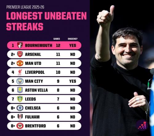 本賽季英超連續不敗場次榜:伯恩茅斯12場居首,阿森納、曼聯11場 X 2026-04-16 20:17:11 體育播報4月16日宣 據Opta統計,伯恩茅斯是本賽季英超連續不敗場次最多的球隊。本賽季英超連續不敗場次排名:伯恩茅斯——12(仍在保持)阿森納——11曼聯——11利物浦——10曼城——9(仍在保持)維拉——8利茲聯——7切爾西——6富勒姆——6布倫特福德——6 足球免費觀看_英超免費觀看_伯恩茅斯免費觀看_足球高清在線_英超高清在線_伯恩茅斯高清在線 足球 英超 伯恩茅斯 曼城 曼聯 利物浦 阿森納 切爾西 布倫特福德 利茲聯 阿斯頓維拉 上一篇: 曼晚:德里赫特或被曼聯放棄,紅魔應買有經驗且能保持健康的中衛 下一篇: TA:卡里克臨場換人太晚被質疑,單場首次換人平均用時65分鐘