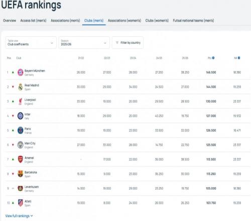 近5個(gè)賽季歐足聯(lián)積分系數(shù):拜仁反超皇馬升至第一 歐足聯(lián)官網(wǎng) 2026-04-16 20:31:38 體育播報(bào)4月16日宣 歐足聯(lián)官方統(tǒng)計(jì)數(shù)據(jù)顯示,拜仁近5個(gè)賽季的歐足聯(lián)積分系數(shù)已反超皇馬,升至第一。近5個(gè)賽季歐足聯(lián)積分系數(shù)排名:1、拜仁慕尼黑(德國(guó)),146.5002、皇家馬德里(西班牙),144.5003、利物浦(英格蘭),130.0004、國(guó)際米蘭(意大利),127.0005、巴黎圣日耳曼(法國(guó)),126.5006、曼城(英格蘭),125.5007、阿森納(英格蘭),113.5008、巴塞羅那(西班牙),113.2509、勒沃庫(kù)森(德國(guó)),105.00010、馬德里競(jìng)技(西班牙),103.750 足球免費(fèi)觀看_皇家馬德里免費(fèi)觀看_拜仁慕尼黑免費(fèi)觀看_足球高清在線_皇家馬德里高清在線_拜仁慕尼黑高清在線 足球 皇家馬德里 拜仁慕尼黑 西甲 德甲 英超 阿森納 曼城 利物浦 意甲 國(guó)際米蘭 巴塞羅那 馬德里競(jìng)技 勒沃庫(kù)森 巴黎圣日耳曼 法甲 歐冠 上一篇: TA:科納特是否續(xù)約關(guān)乎利物浦未來(lái)本賽季只有索博保持了高水平 下一篇: 官方:切爾西與俱樂(lè)部官方首席合作伙伴BingX延長(zhǎng)合作關(guān)系
