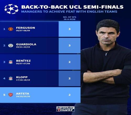 帶領英超球隊連續晉級歐冠半決賽,阿爾特塔成歷史第五人 懂球帝 2026-04-16 21:27:18 阿森納連續兩個賽季晉級歐冠半決賽,阿爾特塔成為第五位帶領英超球隊連續闖進歐冠半決賽的主帥。歐冠改制以來(自1992-93賽季以來)帶領英格蘭球隊連續晉級歐冠半決賽的主帥1 弗格森 曼聯 2006-07賽季至2008-09賽季2 瓜迪奧拉 曼城 2020-21賽季至2022-23賽季3 貝尼特斯 利物浦 2006-07賽季至2007-08賽季4 克洛普 利物浦 2017-18賽季至2018-19賽季5 阿爾特塔 阿森納 2024-25賽季至2025-26賽季英超免費觀看_利物浦免費觀看_阿森納免費觀看_英超高清在線_利物浦高清在線_阿森納高清在線 英超 利物浦 阿森納 阿爾特塔 歐冠半決賽 上一篇: 恩里克接近與巴黎續約至2029年,曼聯挖角希望破滅 下一篇: 官方:切爾西與其訓練服贊助商BingX續約至2627賽季