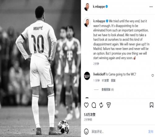 歐冠遭淘汰!姆巴佩社媒:我向大家保證,我們很快會重返勝利軌道 直播吧 2026-04-17 07:10:10 體育播報04月17日宣 皇馬在歐冠1/4決賽被拜仁淘汰,姆巴佩賽后發表社媒。姆巴佩:“我們拼到了最后一刻,但還是未能如愿。在如此關鍵的賽事中出局固然令人失望,但我們必須向前看。全隊需要深刻反思自身問題,避免重蹈覆轍。我們永不言棄!!!在皇馬,失敗從來不是、未來也絕不會是我們的選擇。我可以向大家保證:我們很快就會重返勝利軌道。” 足球免費觀看_姆巴佩免費觀看_西甲免費觀看_足球高清在線_姆巴佩高清在線_西甲高清在線 足球 姆巴佩 西甲 皇家馬德里 拜仁慕尼黑 德甲 歐冠 上一篇: 染紅致出局!卡馬文加:我為失誤承擔全部責任,向球隊和球迷致歉 下一篇: 甚至更快!對比梅西73球賽季,凱恩達成50球時同期所耗場次更少