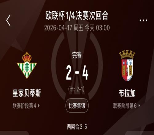 皇家貝蒂斯主場在2-0領(lǐng)先的情況下,連丟4球,2-4輸給布拉加,總比分3-5無緣歐聯(lián)半決賽。