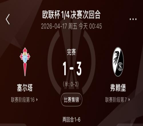 塞爾塔次回合主場1-3弗賴堡,總比分1-6完敗,被淘汰出局。