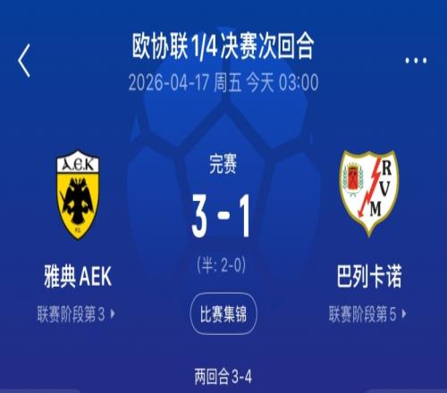 在歐協(xié)聯(lián)賽場,巴列卡諾也差點崩盤,客場1-3不敵雅典AEK,總比分4-3險勝晉級歐協(xié)聯(lián)四強。