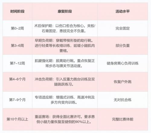 根據(jù)一項針對118名男性職業(yè)足球運動員的研究,術(shù)后平均7個月可恢復不受限訓練,平均9個月恢復正式比賽。但回歸后的前兩個賽季中,仍有18%的球員無法達到傷前水平,二次斷裂率約為8%。同時,還有大量醫(yī)學研究給出的數(shù)據(jù)表明,24%的職業(yè)球員在跟腱斷裂之后,無法重返賽場。即便能夠回歸,他們的表現(xiàn)也有明顯下滑。爆發(fā)力、彈跳高度和變向速度都難以重回巔峰。