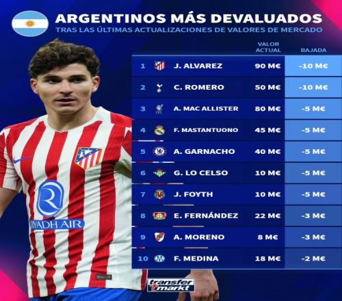 阿根廷球員身價下跌榜:阿爾瓦雷斯、羅梅羅下跌1000萬歐最多 Instagram 2026-04-17 16:40:49 體育播報4月17日宣 德國轉會市場更新了球員的身價,列出了阿根廷球員身價下跌榜,阿爾瓦雷斯、羅梅羅下跌1000萬歐最多。阿根廷球員身價下跌排名(括號內為目前身價):阿爾瓦雷斯(9000萬歐):-1000萬歐羅梅羅(5000萬歐):-1000萬歐麥卡利斯特(8000萬歐):-500萬歐馬斯坦托諾(4500萬歐):-500萬歐加納喬(4000萬歐):-500萬歐洛塞爾索(1000萬歐):-500萬歐福伊特(1000萬歐):-500萬歐埃茲奎爾(2200萬歐):-300萬歐A·莫雷諾(800萬歐):-300萬歐梅迪納(1800萬歐):-200萬歐 足球免費觀看_德甲免費觀看_勒沃庫森免費觀看_足球高清在線_德甲高清在線_勒沃庫森高清在線 足球 德甲 勒沃庫森 英超 熱刺 西甲 馬德里競技 比利亞雷亞爾 利物浦 皇家馬德里 上一篇: 自2022年以來,首次有四支英格蘭球隊連續兩個賽季闖入歐戰半決賽 下一篇: 早報:歐聯、歐協聯四強誕生