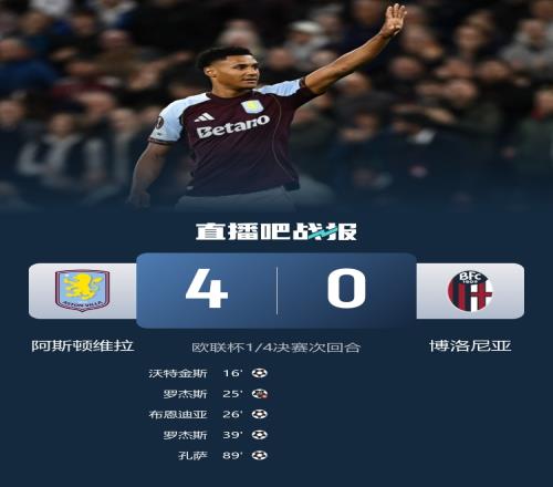 沃特金斯、布恩迪亞、孔薩破門,羅杰斯建功+失點;維拉晉級四強將迎戰諾丁漢森林。