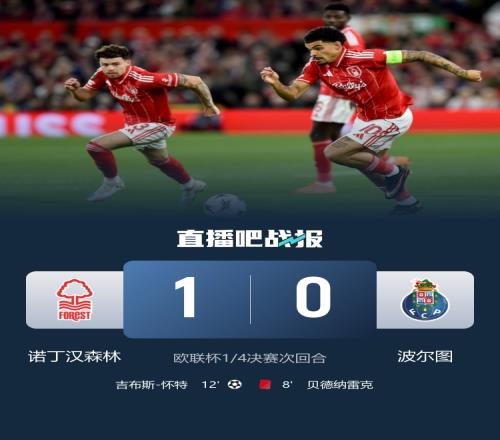 吉布斯-懷特制勝,貝德納雷克蹬踏伍德吃直紅,;諾丁漢森林晉級歐聯杯四強,他們在半決賽的對手將是阿斯頓維拉。