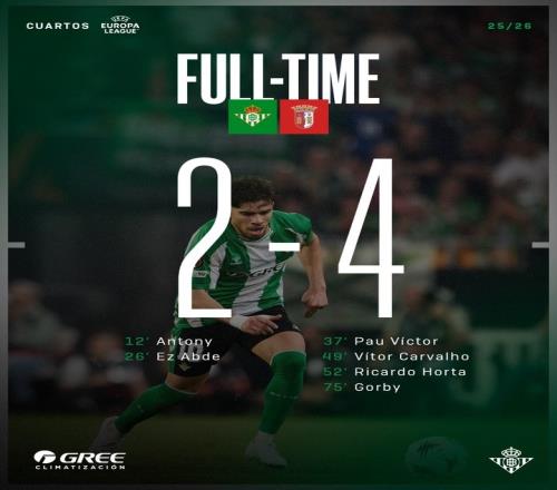 本輪歐聯杯八強戰完賽一場,首回合客場1-1戰平的貝蒂斯,回到主場被布拉加2-4大逆轉。