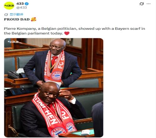 歐冠1/4決賽次回合,拜仁4-3戰勝皇馬晉級四強??着聊岣赣H、比利時議員皮埃爾·孔帕尼今天戴著拜仁圍巾參加議會。