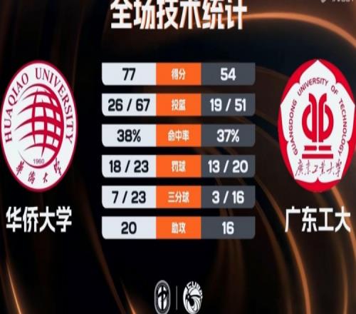 末節決戰,葉潤峰有攻有傳帶領華僑大學擴大領先,盧焯誠連續內線強打止血回應,曹國梁三分命中后華僑大學領先到20分。廣東工大連續殺傷追分,但胡俊杰三分再次回應,華僑大學始終保持不錯的防守態度,并保持住20分以上領先,最終華僑大學77-54戰勝廣東工大。