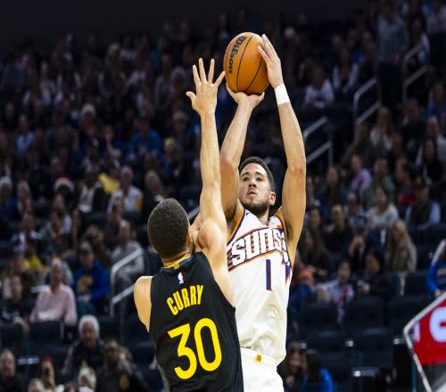 布克(場均26.1分,6次助攻)是一名技術(shù)細膩且高效的三威脅得分手,他是太陽的頭號攻擊箭頭,也是這支極其依賴三分球的球隊制造罰球機會的核心。勇士是聯(lián)盟中僅有的四支在場均三分命中數(shù)(14.8個)和出手數(shù)(40.8次)上都超過太陽的球隊之一,而太陽陣中并沒有那種能在進攻發(fā)起點給勇士制造麻煩的靈敏型后衛(wèi)與鋒線。
