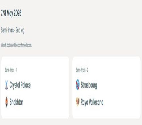 歐協(xié)聯(lián)半決賽對陣出爐:水晶宮對陣頓涅茨克礦工 愛奇藝體育 2026-04-17 17:48:05 歐協(xié)聯(lián)1/4決賽次回合戰(zhàn)罷,四強隊伍產(chǎn)生,半決賽對陣出爐。兩場焦點對決,愛奇藝體育屆時將全媒體獨播。 頓涅茨克礦工以總比分5-2擊敗阿爾克馬爾;水晶宮以4-2的總比分戰(zhàn)勝佛羅倫薩,這兩支球隊將爭奪一個決賽名額。斯特拉斯堡以4-2的總比分逆轉(zhuǎn)淘汰美因茨;巴列卡諾以4-3的總比分險勝雅典AEK,這兩支球隊將會展開另外一組半決賽的較量。2025/26賽季歐協(xié)聯(lián)半決賽對陣頓涅茨克礦工vs水晶宮巴列卡諾vs斯特拉斯堡歐協(xié)聯(lián)免費觀看_水晶宮隊免費觀看_巴列卡諾免費觀看_歐協(xié)聯(lián)高清在線_水晶宮隊高清在線_巴列卡諾高清在線 歐協(xié)聯(lián) 水晶宮隊 巴列卡諾 美因茨隊 頓涅茨克礦工隊 上一篇: 歐協(xié)聯(lián)半決賽對陣出爐:水晶宮對陣頓涅茨克礦工 下一篇: 曼聯(lián)小梅西沖擊三冠王,俱樂部仍擔心皇薩仁挖角!明年就有大風險