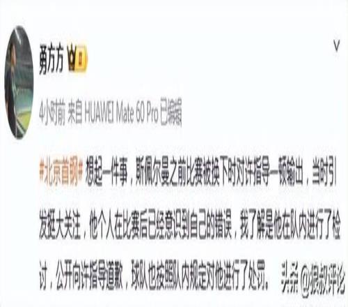 賽前,北京記者勇方方發文,提到了斯佩爾曼和許利民的沖突話題表示:“斯佩爾曼之前比賽被換下時對許指導一頓輸出,當時引發挺大關注,他個人在比賽后已經意識到自己的錯誤,我了解是他在隊內進行了檢討,公開向許指導道歉,球隊也按照隊內規定對他進行了處罰。”